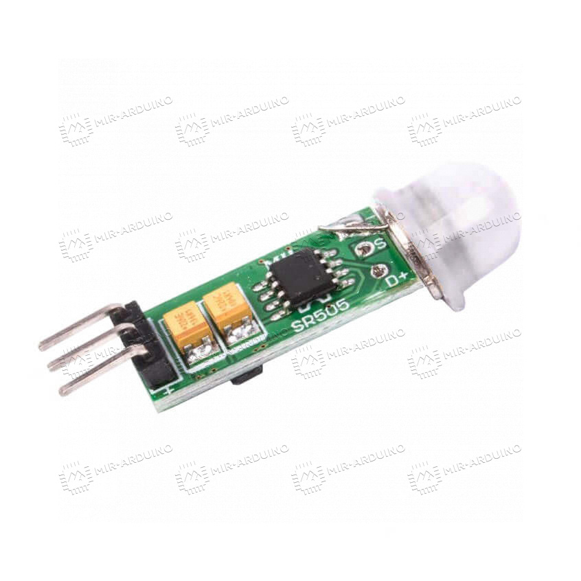 Инфракрасный датчик движения HC-SR505 устанавливается в осветительные системы, выполненные на платформе Ардуино. С помощью датчика можно регулировать подсветку в помещении или на улице, он может применяться в охранных системах и другой автоматике. Выполнен в виде печатной платы с зафиксированным на ней датчиком, может легко интегрироваться в различные устройства. Датчик срабатывает только на движение человека, на выходе сигнал продолжается порядка 8 секунд. Угол зоны обнаружения может достигать 100°. Есть три выхода для подключения – земля, сигнал, питание.